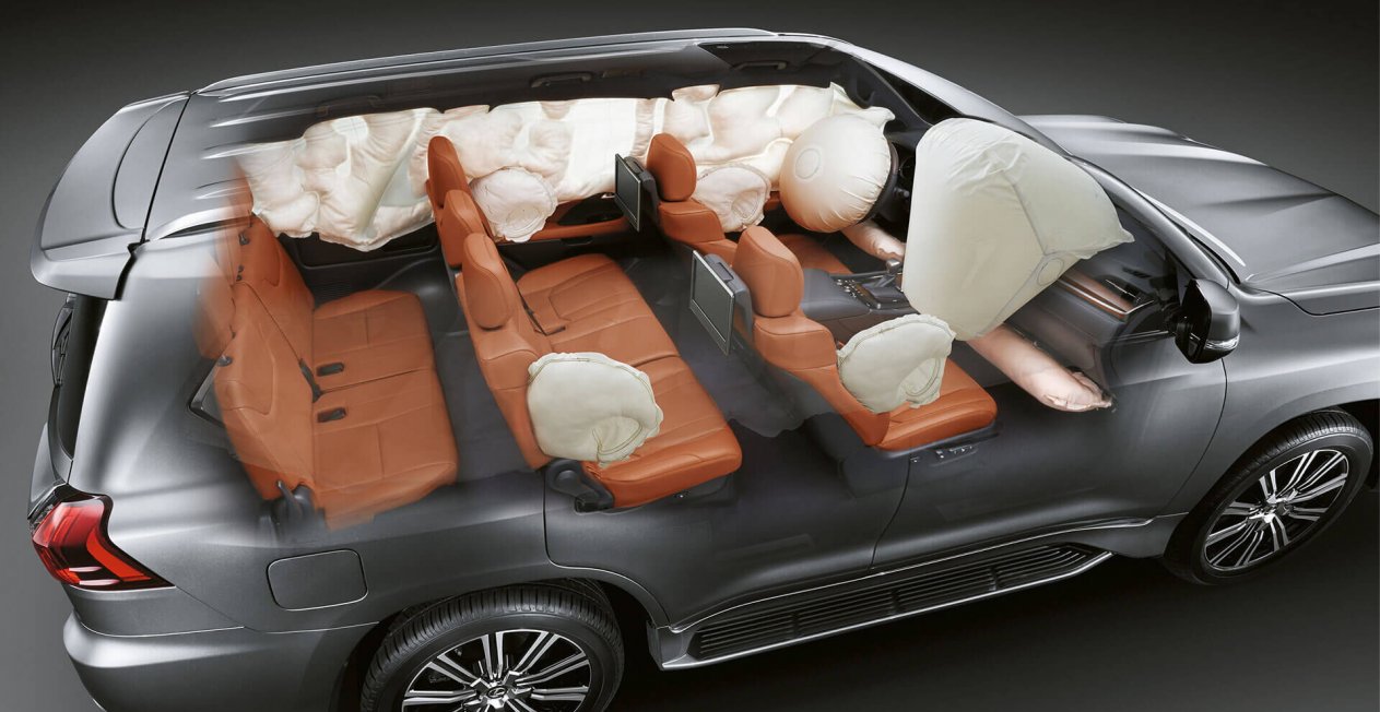 10 подушек безопасности: 2 фронтальные, 2 коленные для водителя и переднего пассажира, 4 боковые для первого и второго рядов сидений, 2 шторки безопасности на всю длину салонаДаДаДаДаДаДа